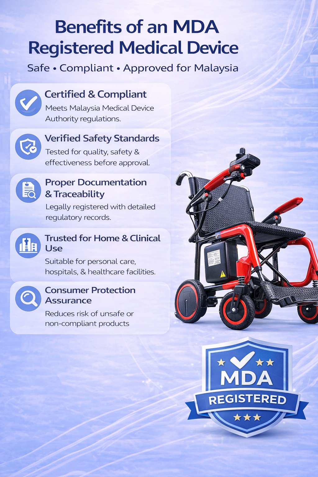 For products such as electric wheelchairs, hospital beds, and mobility aids, MDA registration means the device has undergone proper documentation, conformity assessment, and regulatory approval. This protects users, caregivers, and healthcare providers from unsafe or non-compliant products.