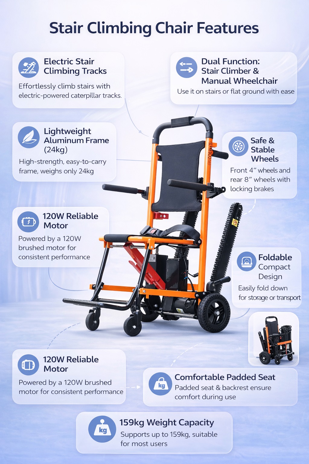 The Fresco Bike climbing chair is designed with real caregiver situations in mind — not just specifications on paper. It focuses on safety, smooth stair movement, and easy handling so even one caregiver can operate it confidently. Whether for daily home use or short-term recovery, the chair provides a controlled and stable transfer experience that greatly reduces physical strain and risk of injury.