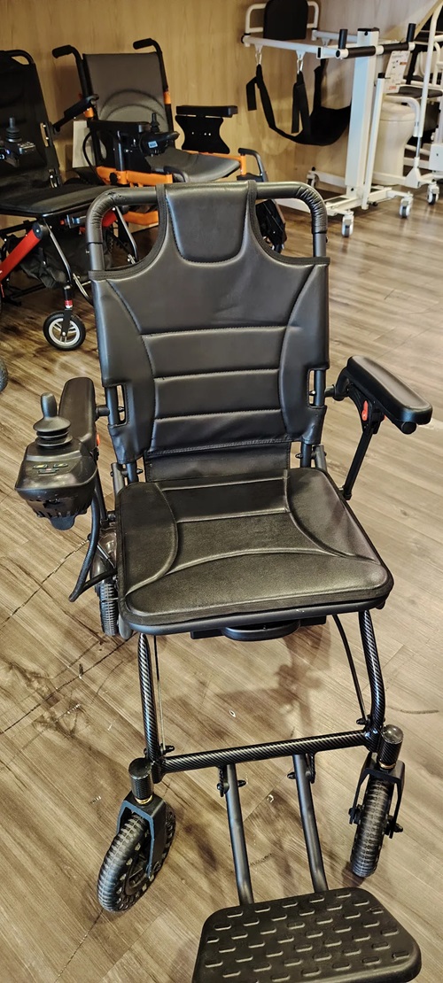 The 15kg Black Super Lightweight Electric Wheelchair (Carbon Printed) is designed for users seeking a blend of portability, style, and functionality. Its carbon-printed design adds a modern aesthetic to a robust and user-friendly mobility solution.