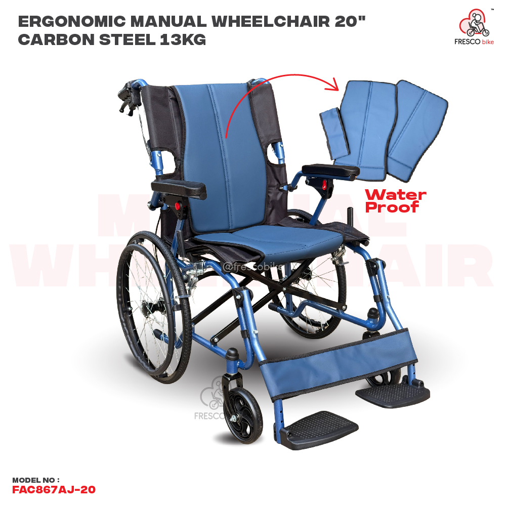 Manual Wheelchair FAC867AI-20 is a durable and comfortable mobility aid designed for daily use at home, hospital, or outdoor travel. Made with strong carbon steel and fitted with 20-inch rear wheels, it provides smooth movement, stability, and long-lasting performance.