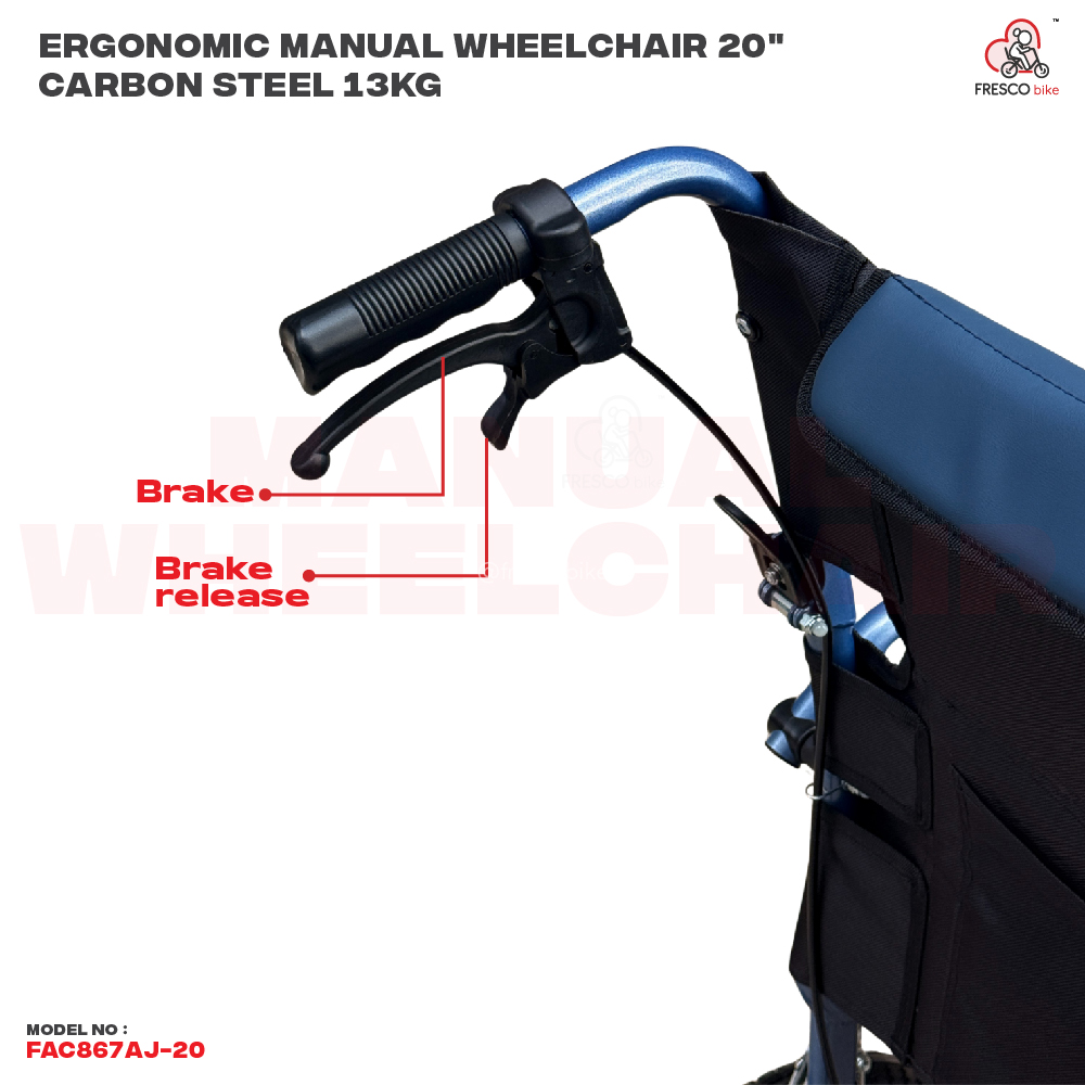 Manual Wheelchair FAC867AI-20 is a durable and comfortable mobility aid designed for daily use at home, hospital, or outdoor travel. Made with strong carbon steel and fitted with 20-inch rear wheels, it provides smooth movement, stability, and long-lasting performance.