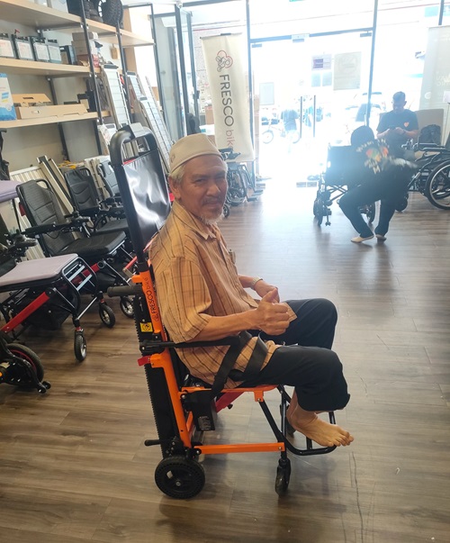 Climbing wheelchair ni sangat bagus digunakan di flat ketika lift rosak.saya syorkan cari bran ni di fresco bike.